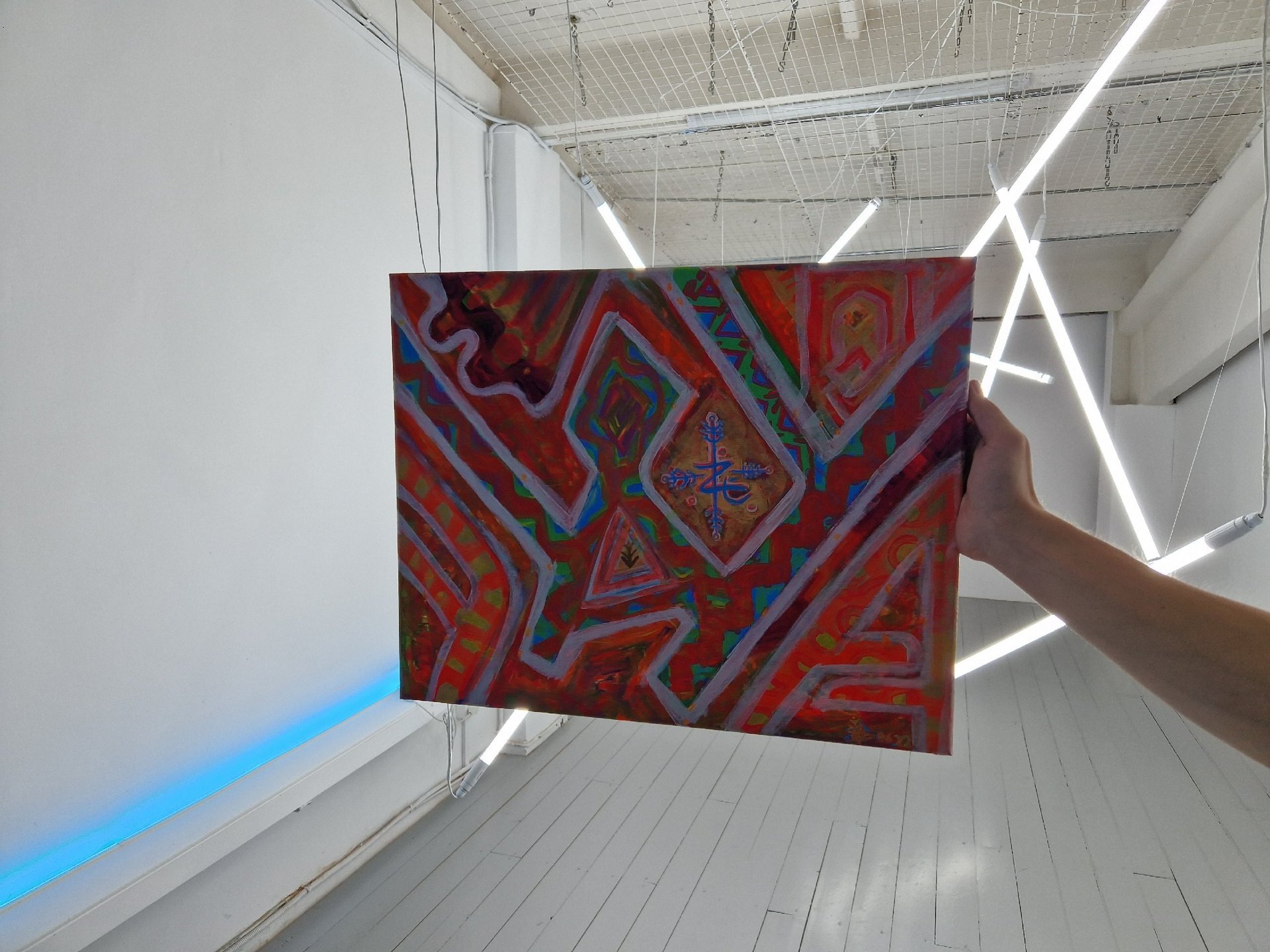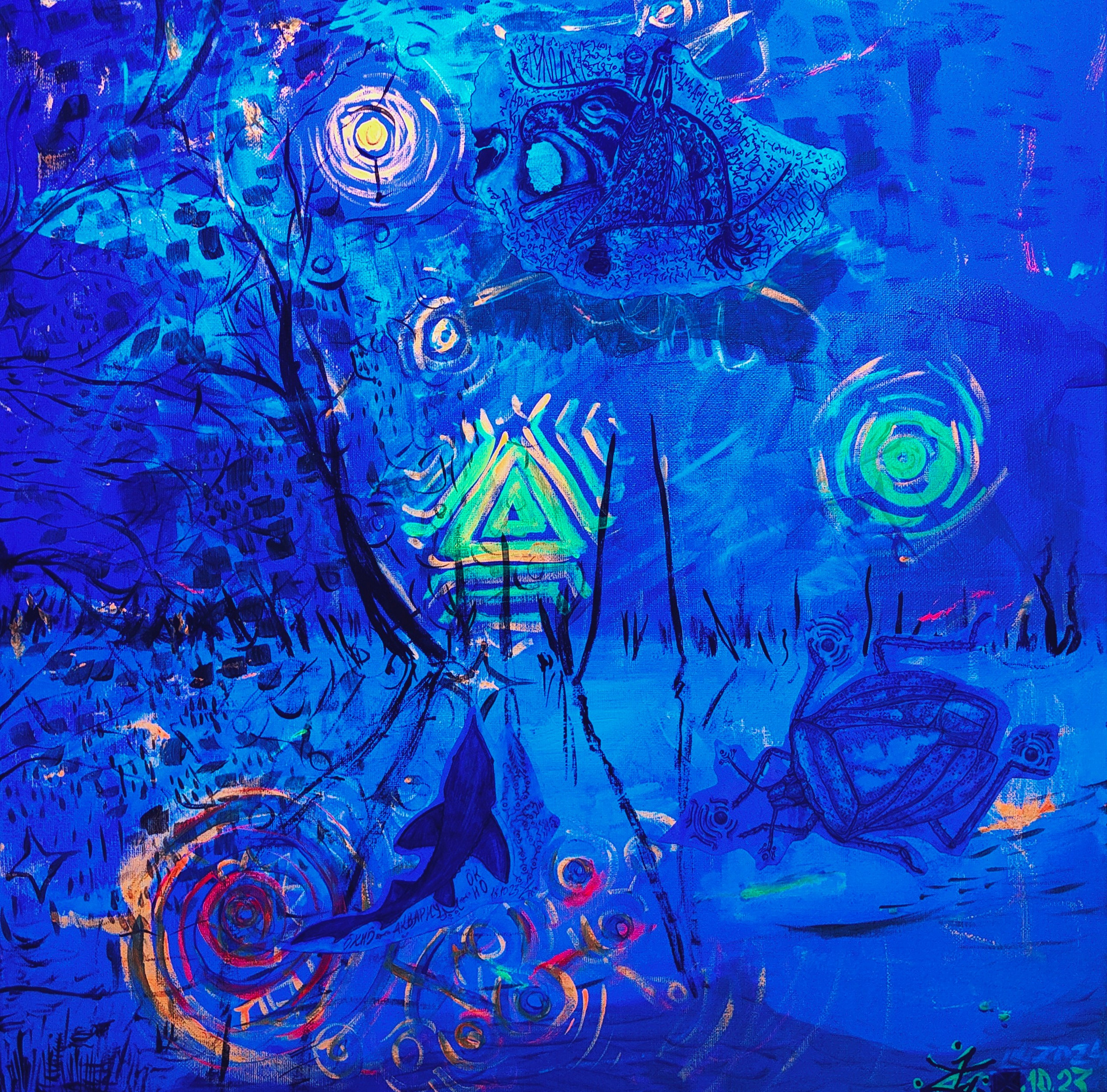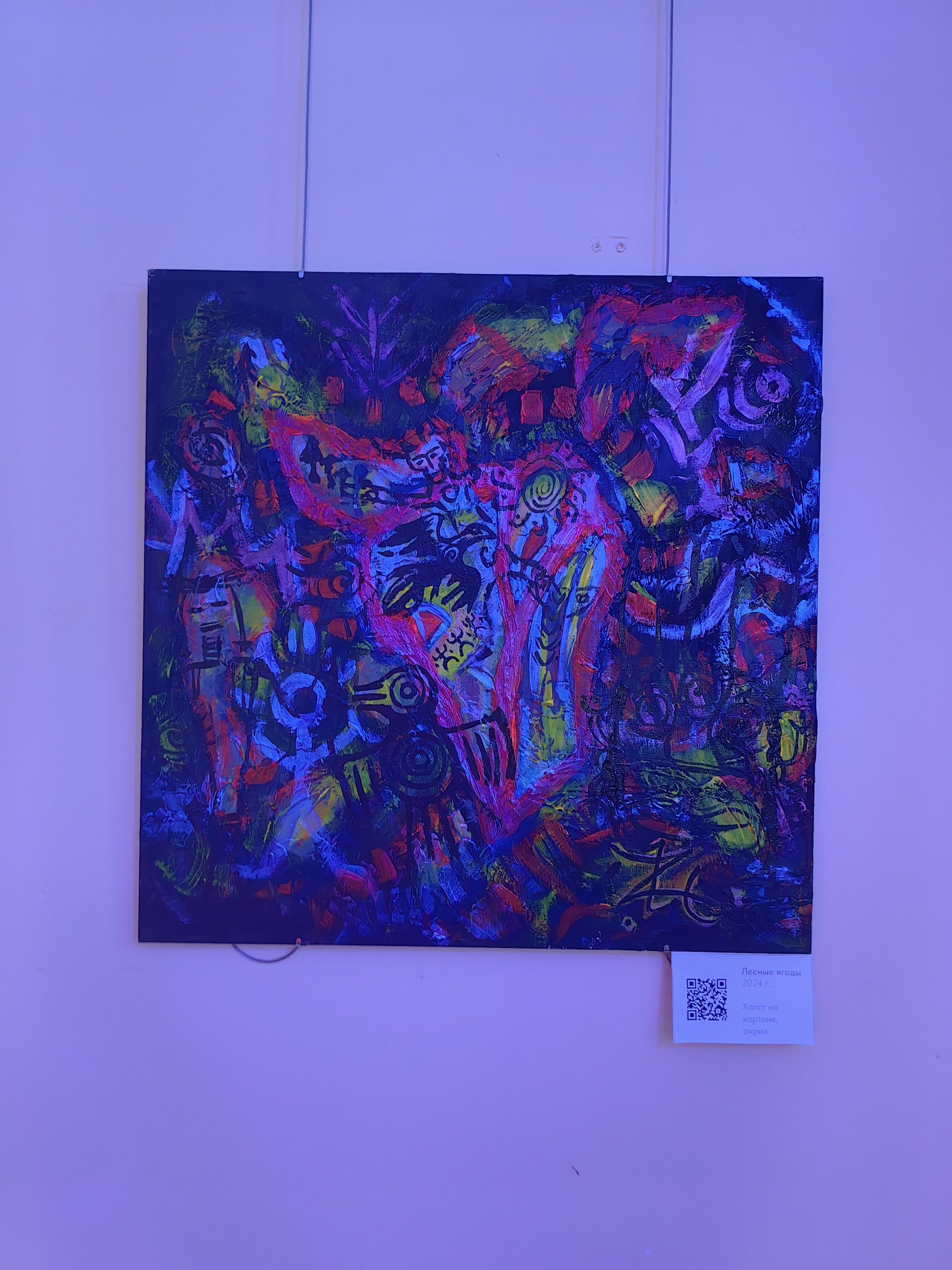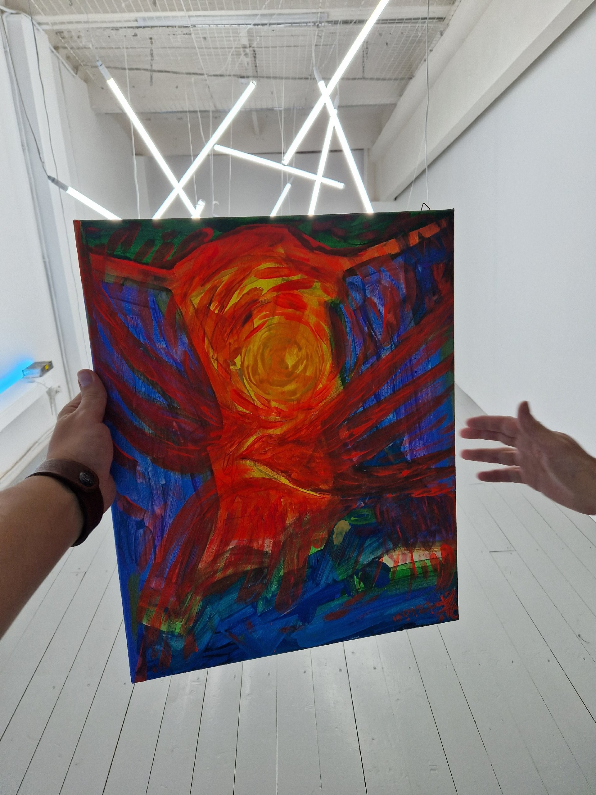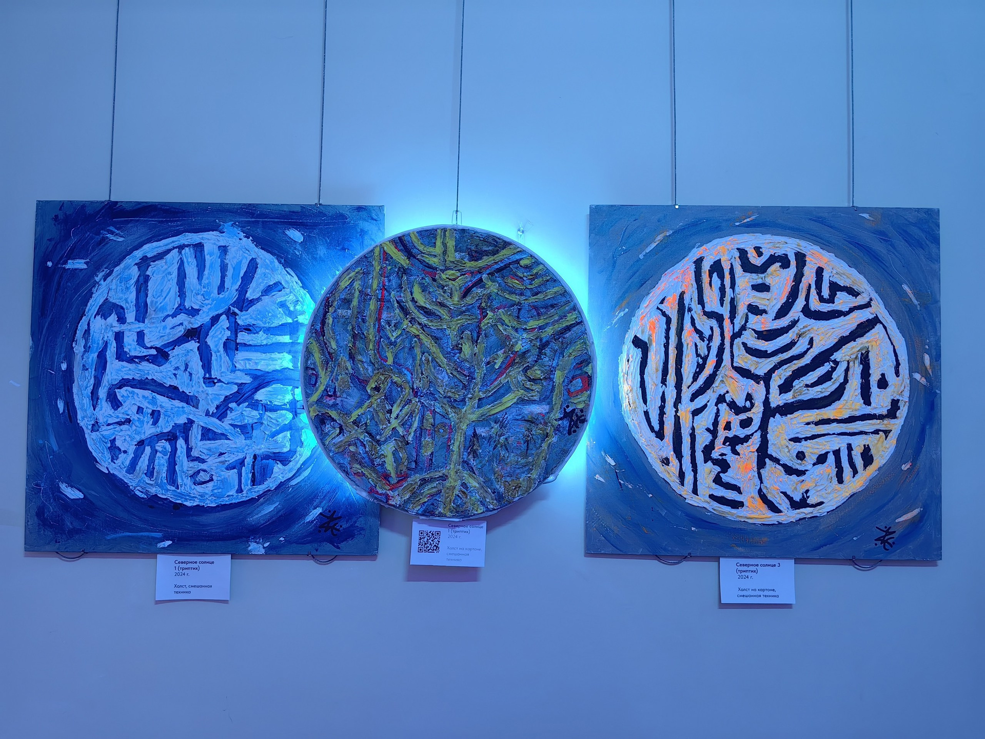 Северное солнце триптих, холст, акрил, подсветка. Картина рельефная состоит из трех самобытных частей: центр «Танцы» D40 см, круглый холст со светодиодной подсветкой по торцу, освещает боковые части слева - квадрат «Озеро» 50х50 см , справа - «Закат» 50х50 с
