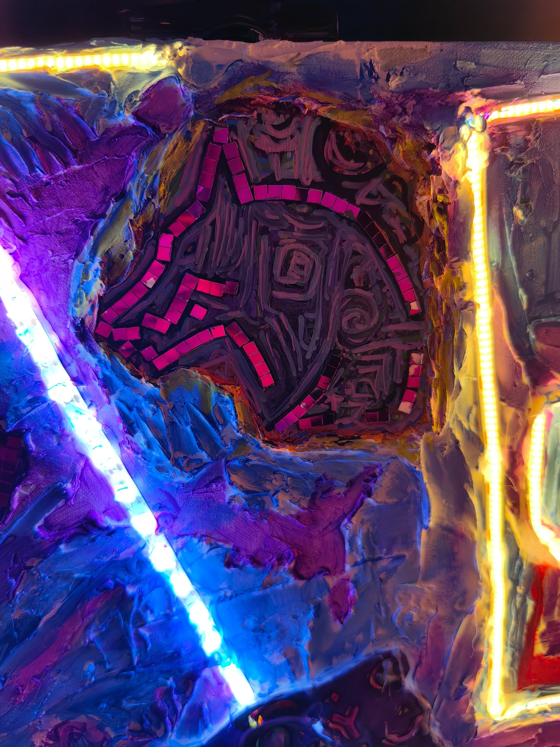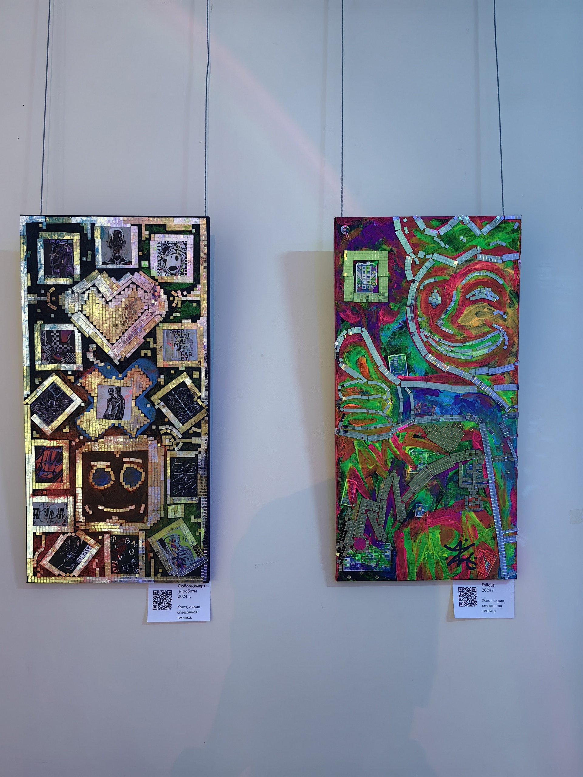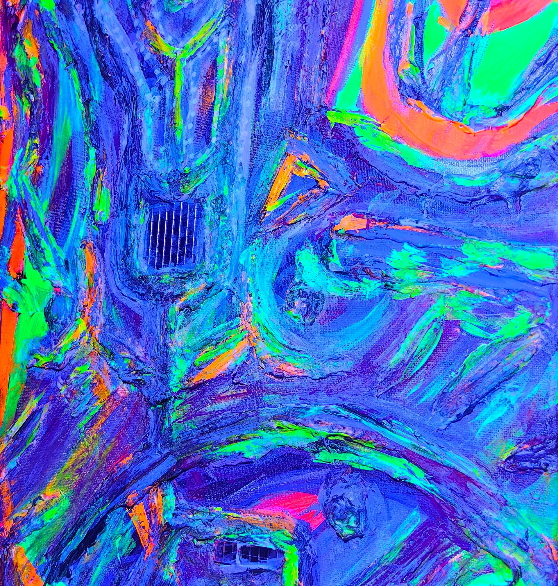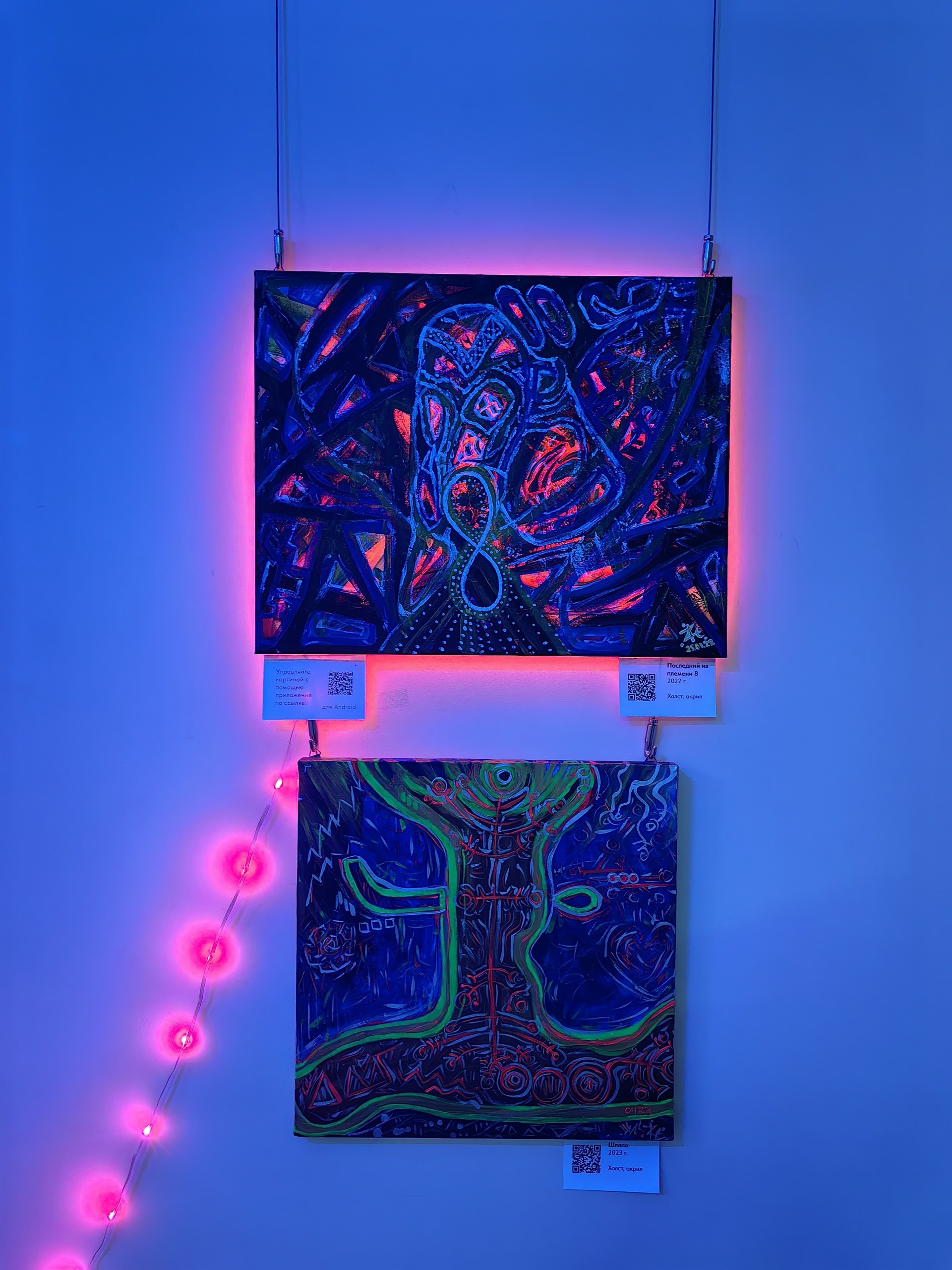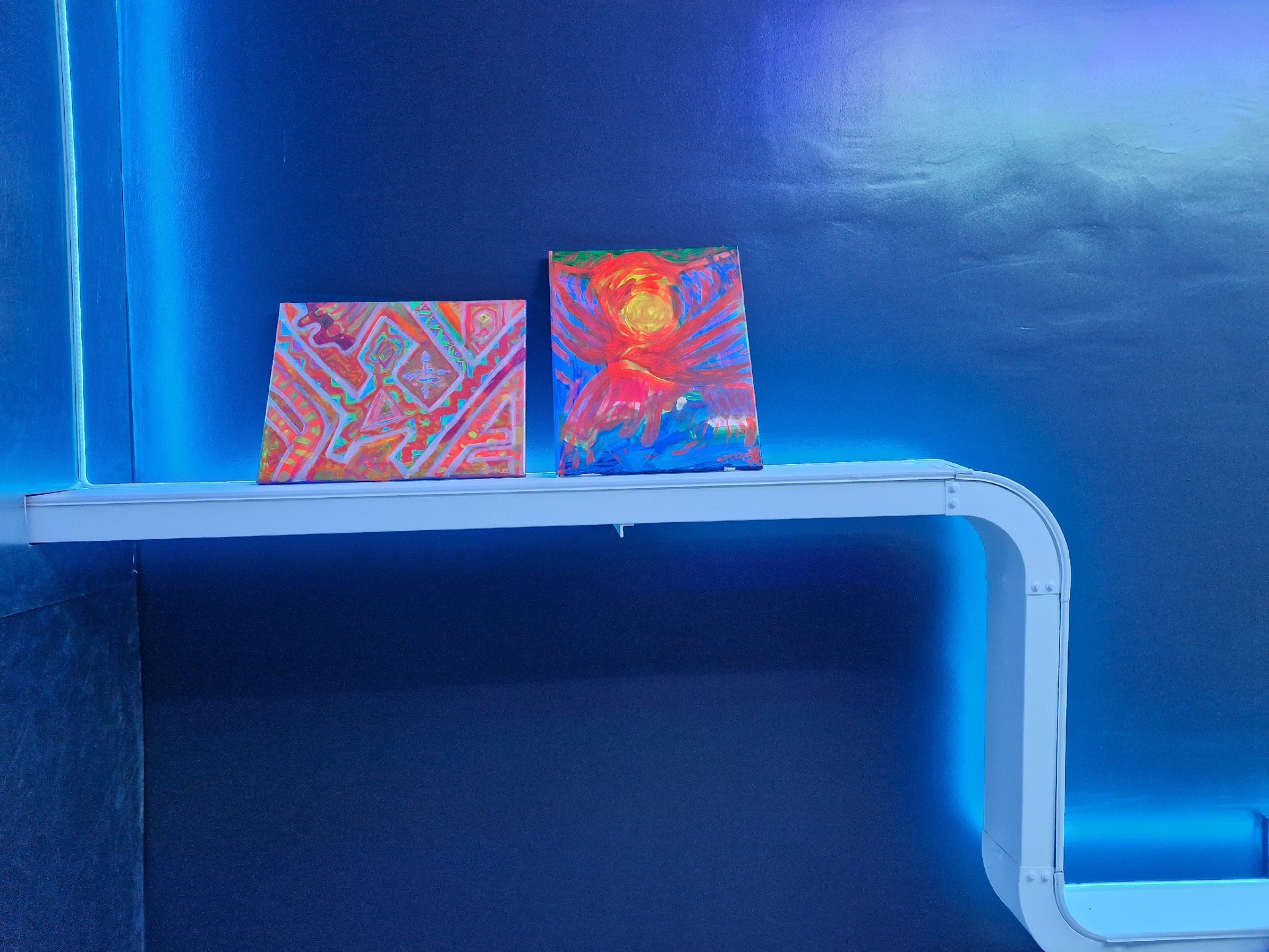 Северное солнце триптих, холст, акрил, подсветка. Картина рельефная состоит из трех самобытных частей: центр «Танцы» D40 см, круглый холст со светодиодной подсветкой по торцу, освещает боковые части слева - квадрат «Озеро» 50х50 см , справа - «Закат» 50х50 с