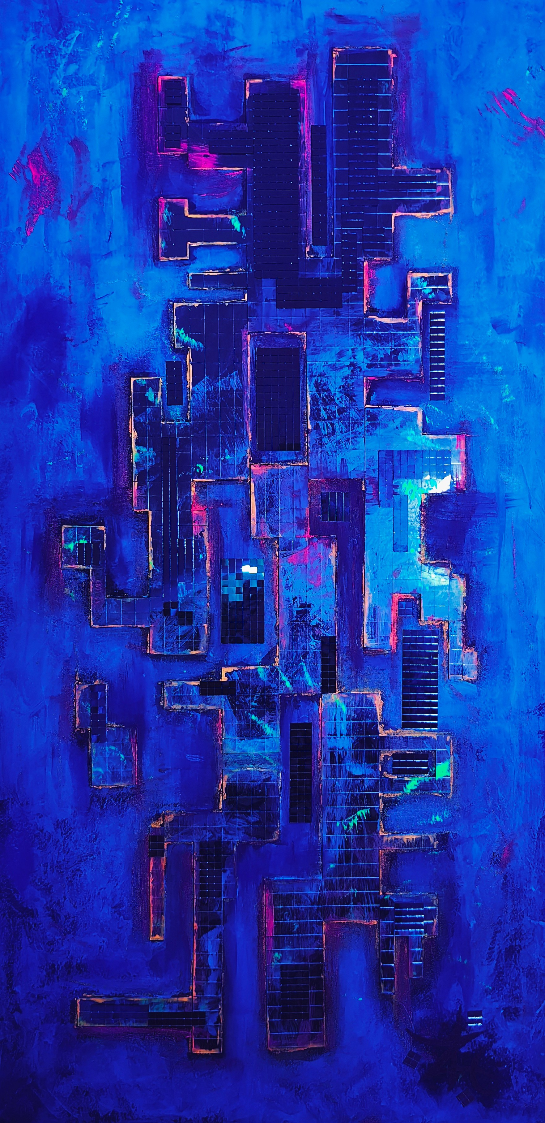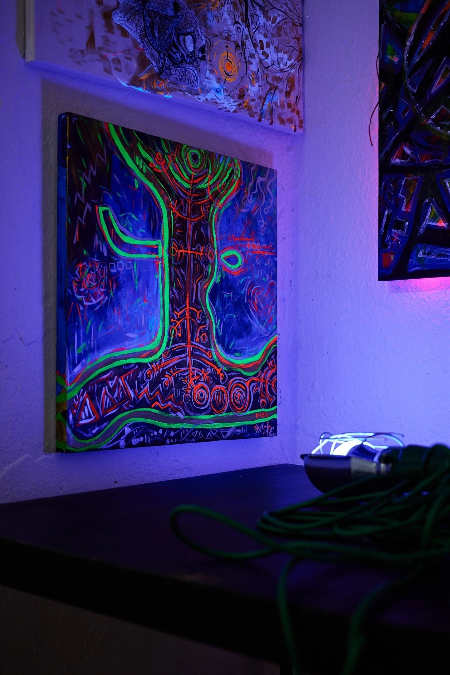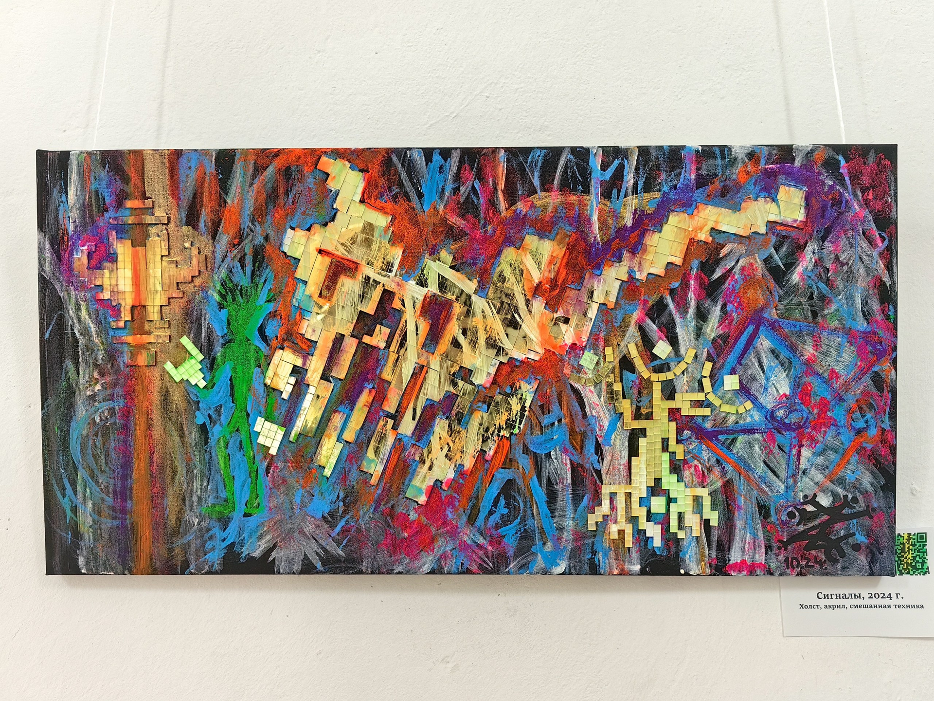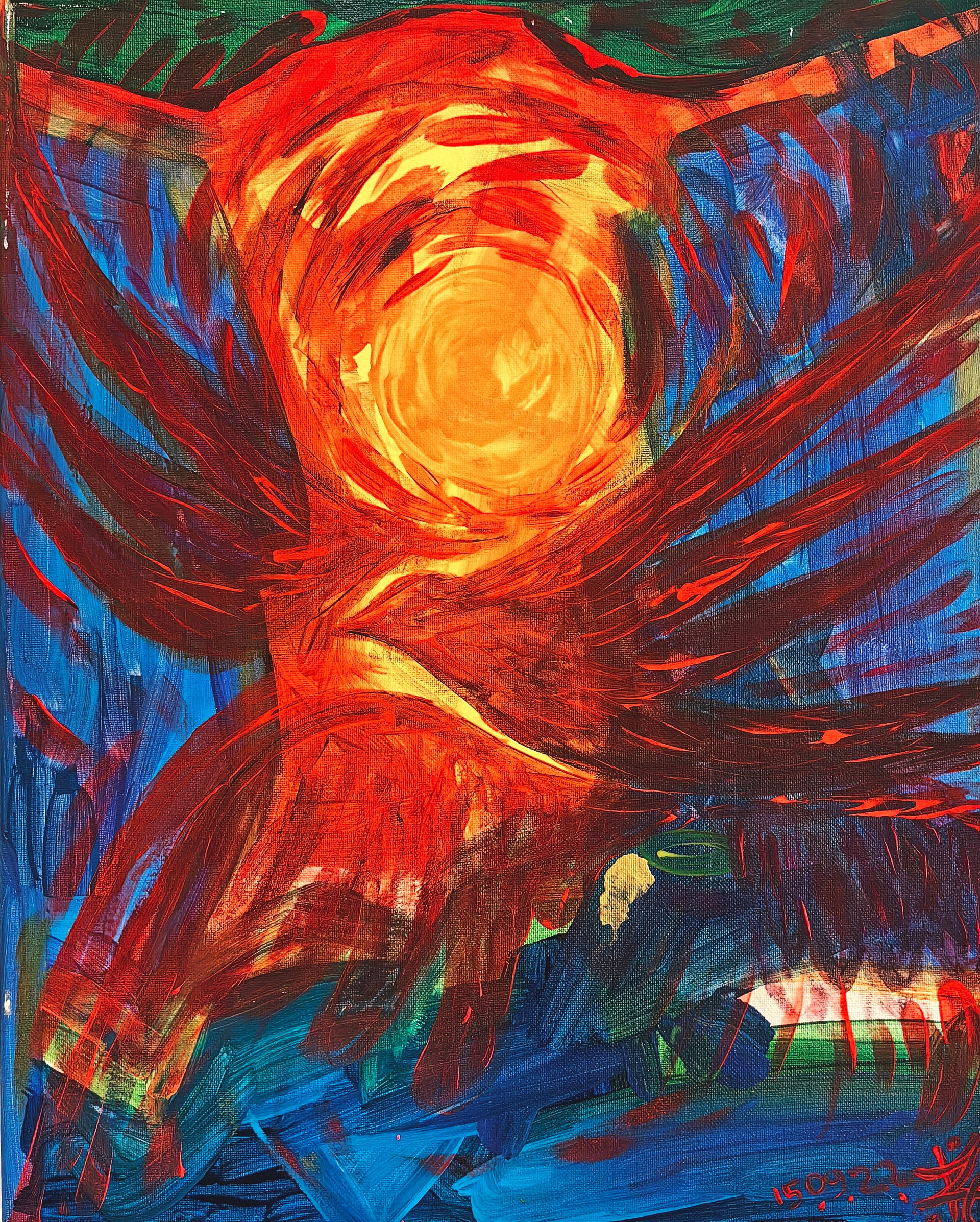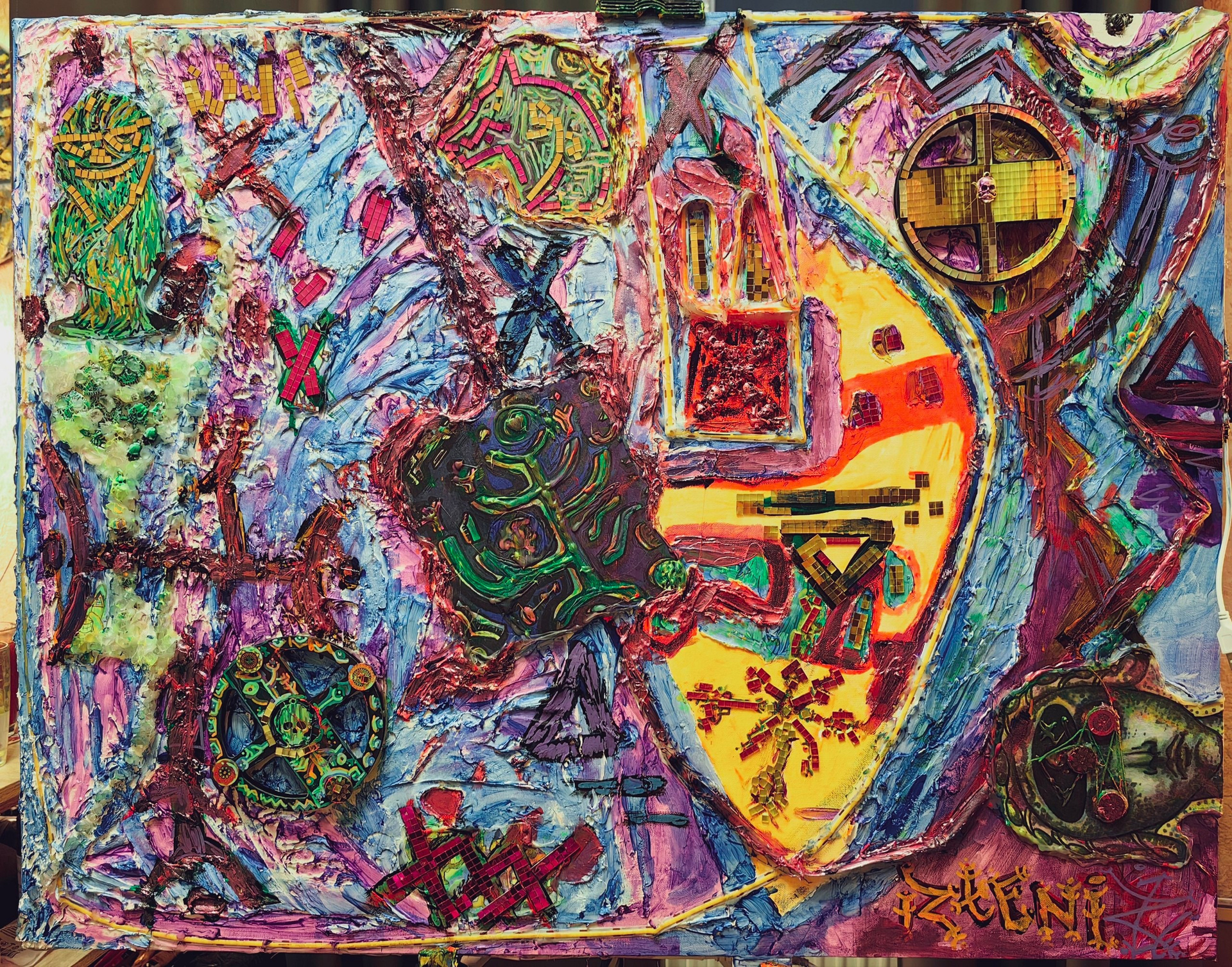 Северное солнце триптих, холст, акрил, подсветка. Картина рельефная состоит из трех самобытных частей: центр «Танцы» D40 см, круглый холст со светодиодной подсветкой по торцу, освещает боковые части слева - квадрат «Озеро» 50х50 см , справа - «Закат» 50х50 с