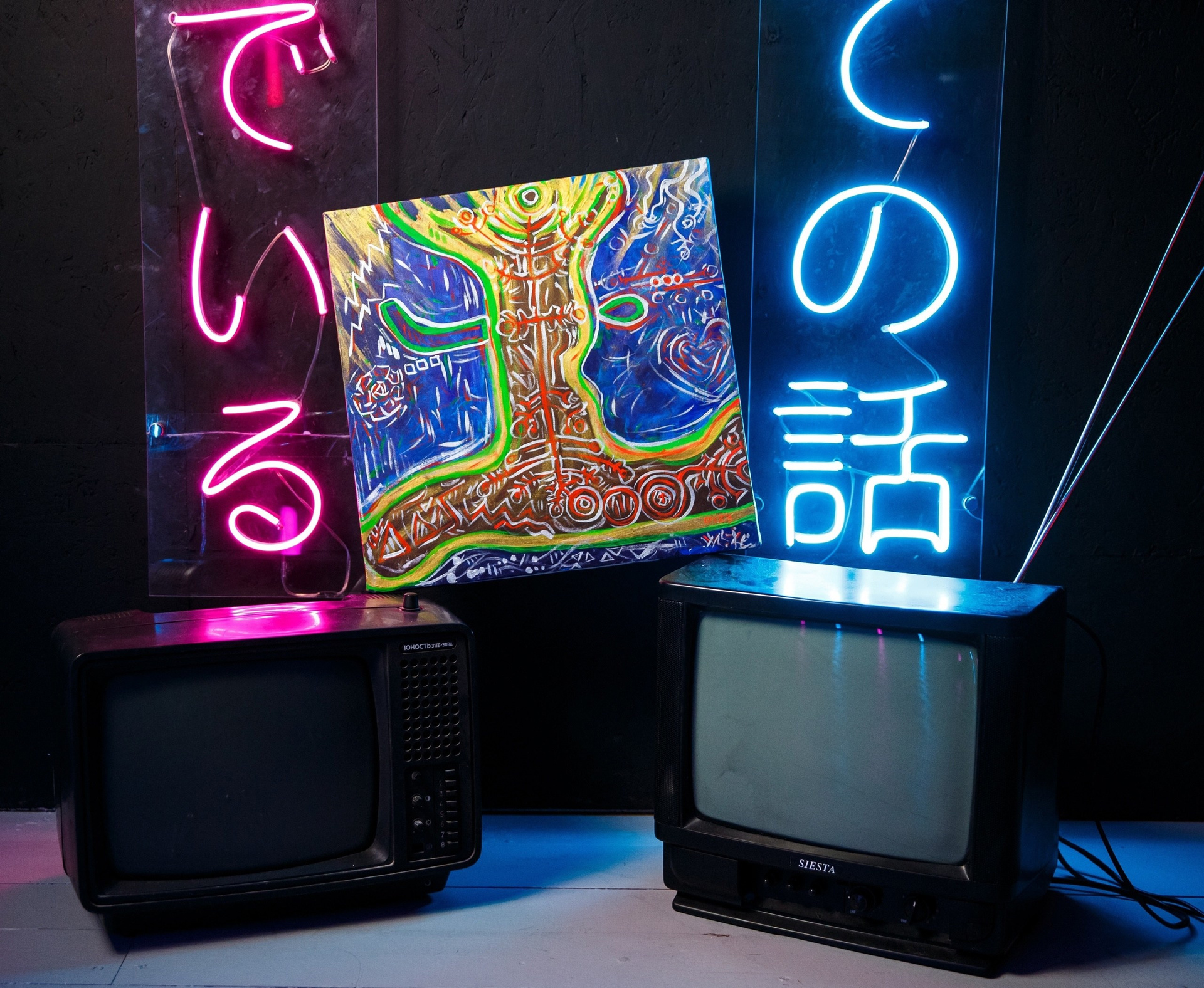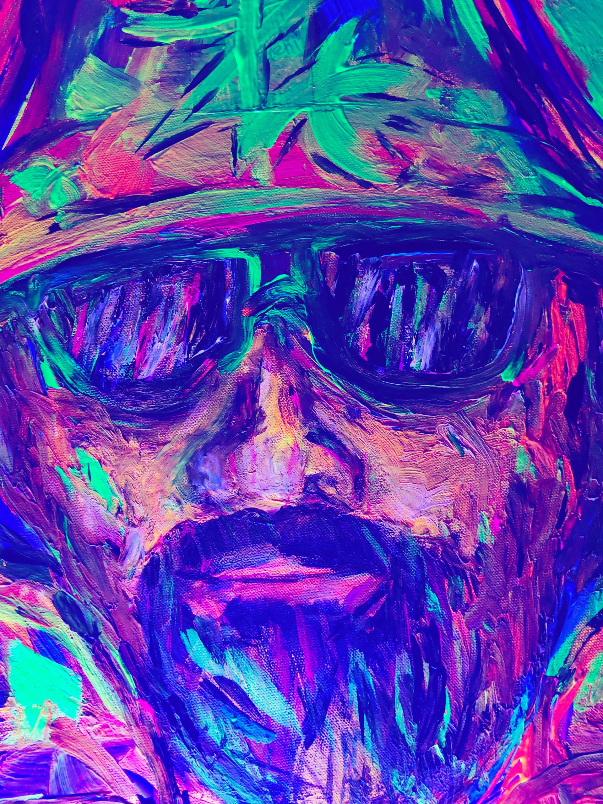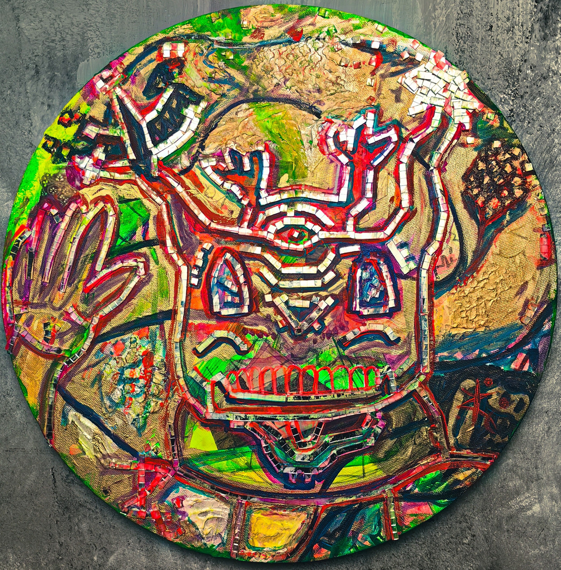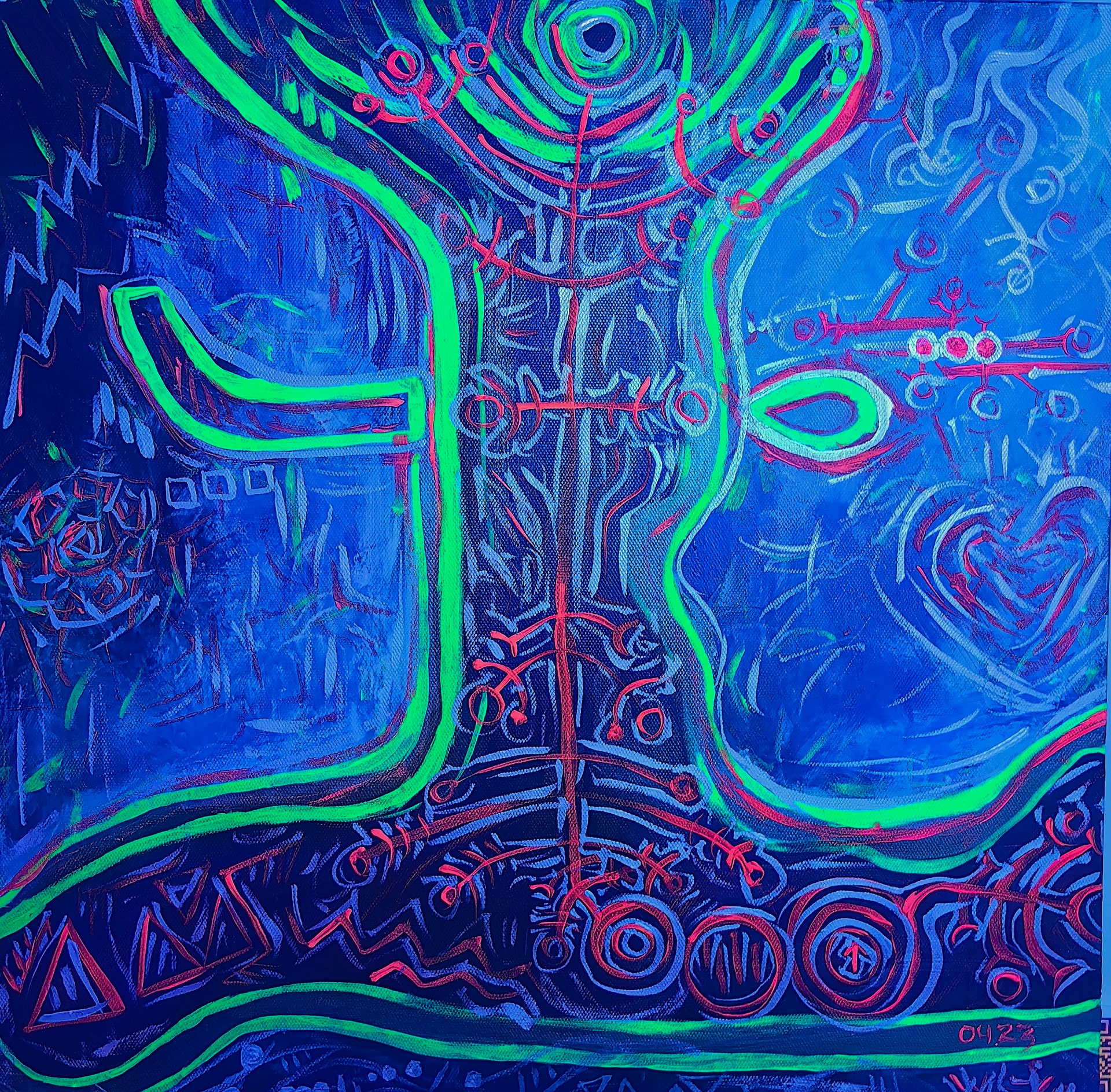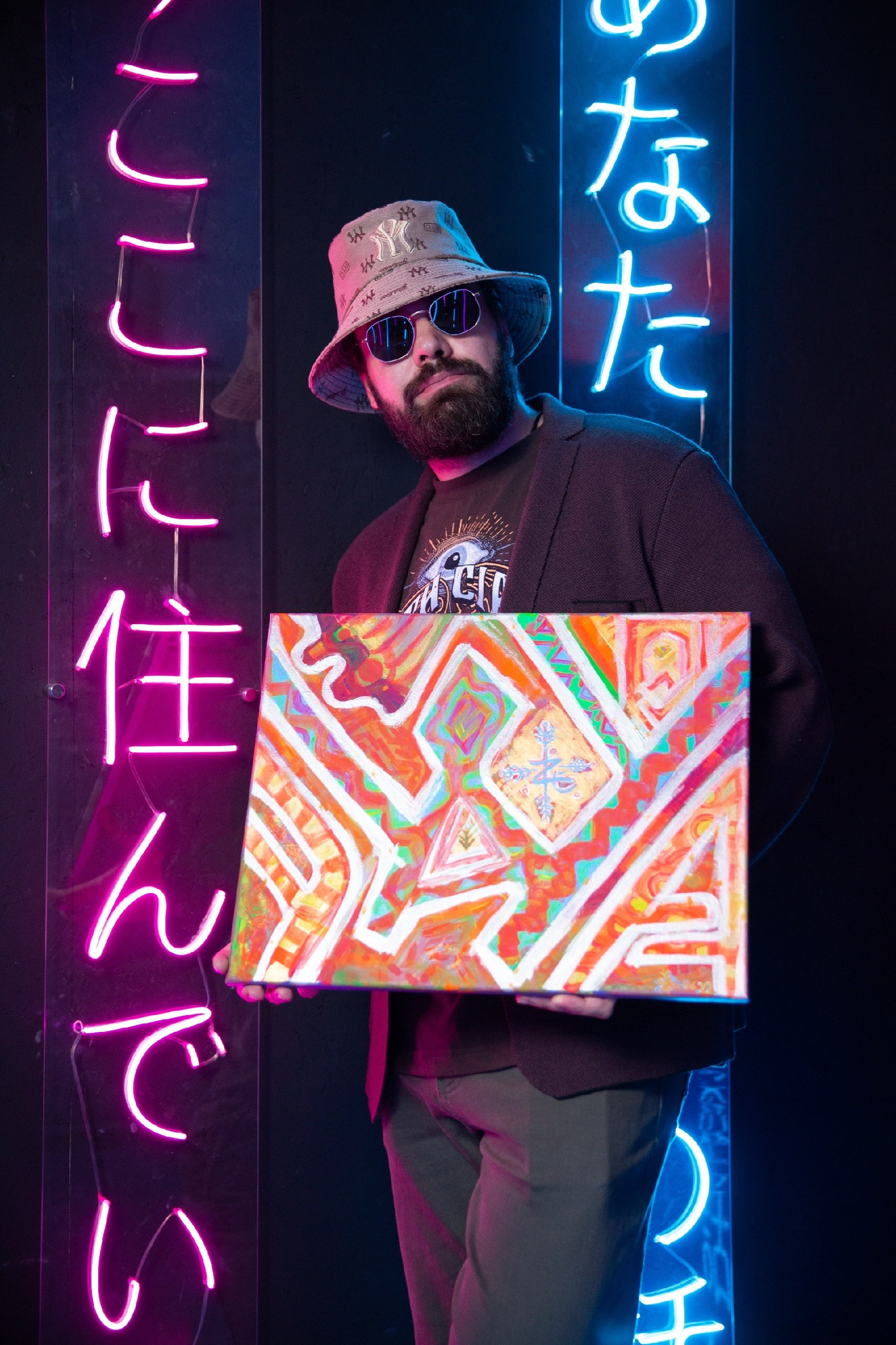 Северное солнце триптих, холст, акрил, подсветка. Картина рельефная состоит из трех самобытных частей: центр «Танцы» D40 см, круглый холст со светодиодной подсветкой по торцу, освещает боковые части слева - квадрат «Озеро» 50х50 см , справа - «Закат» 50х50 с