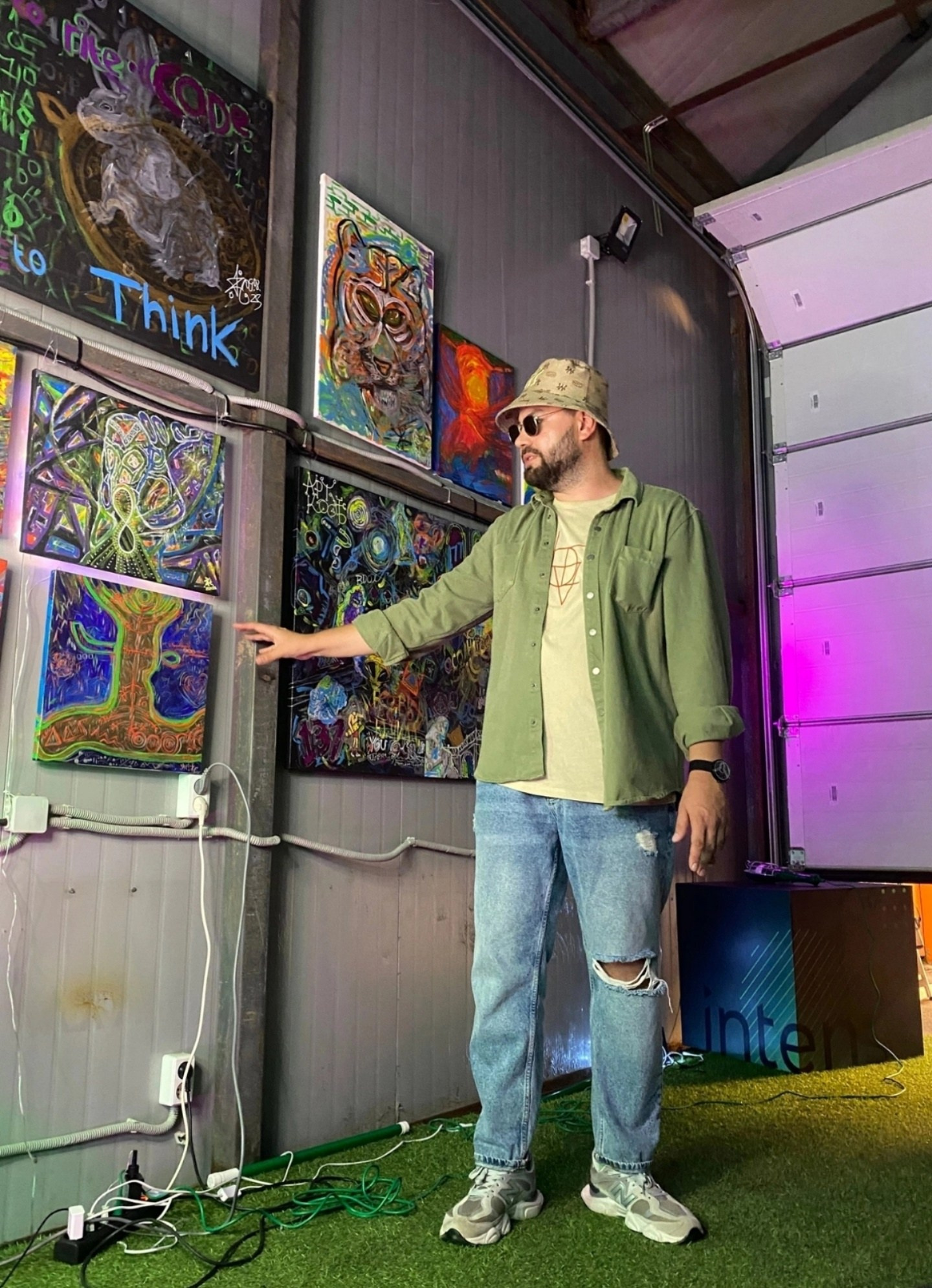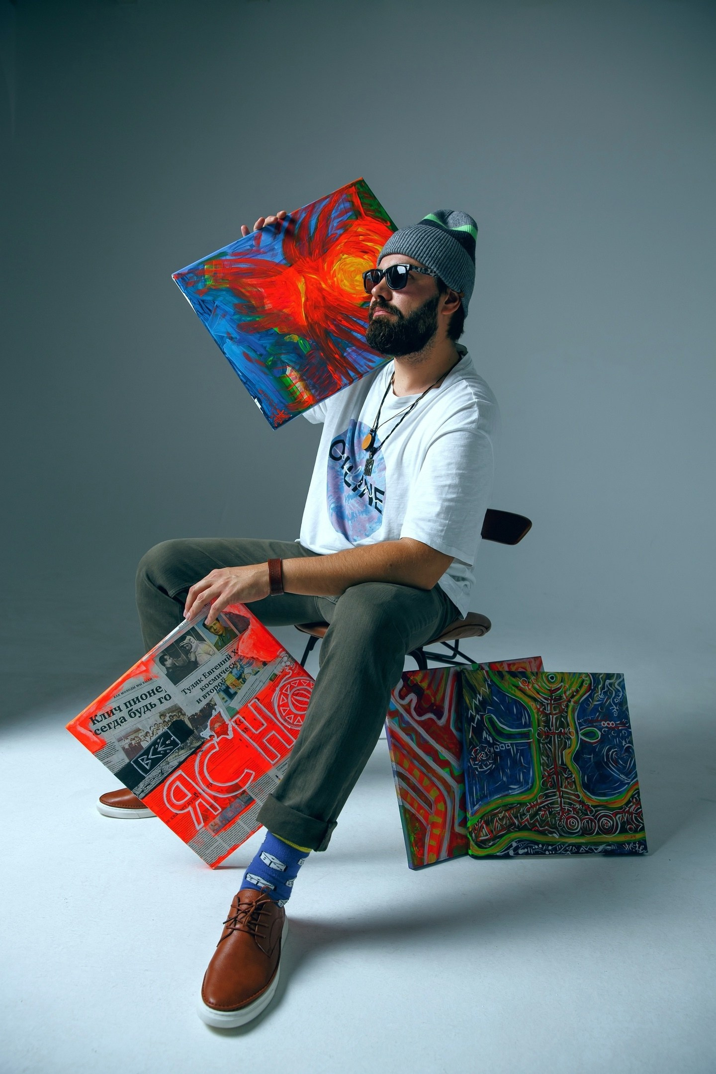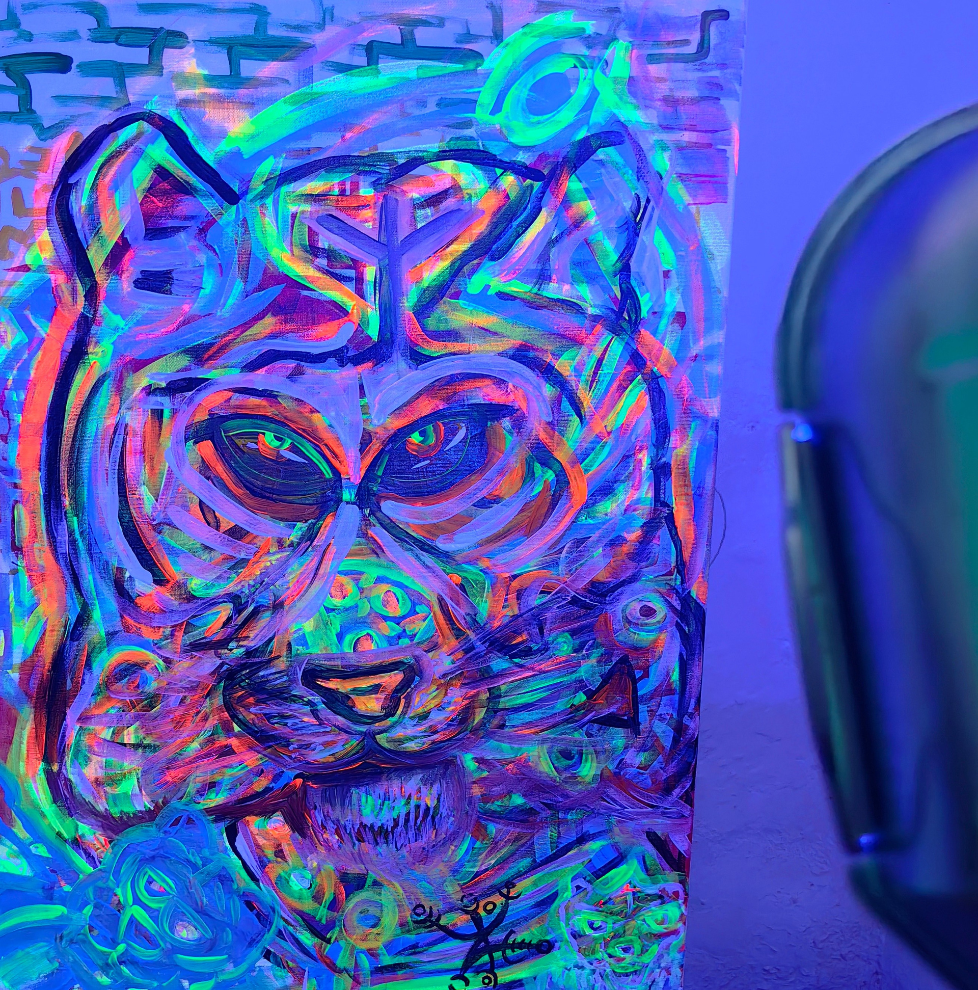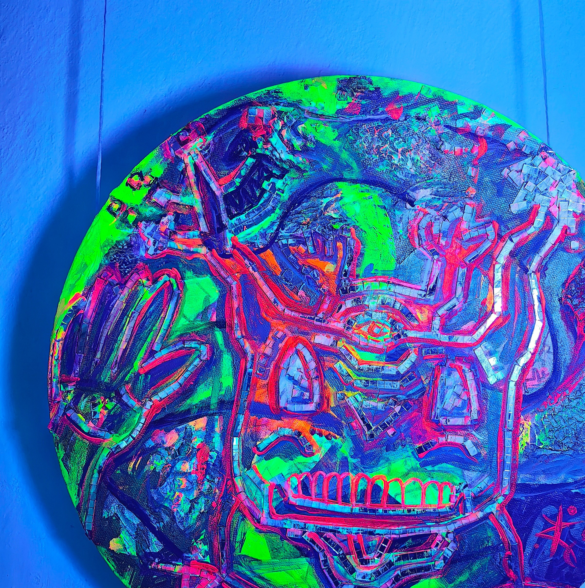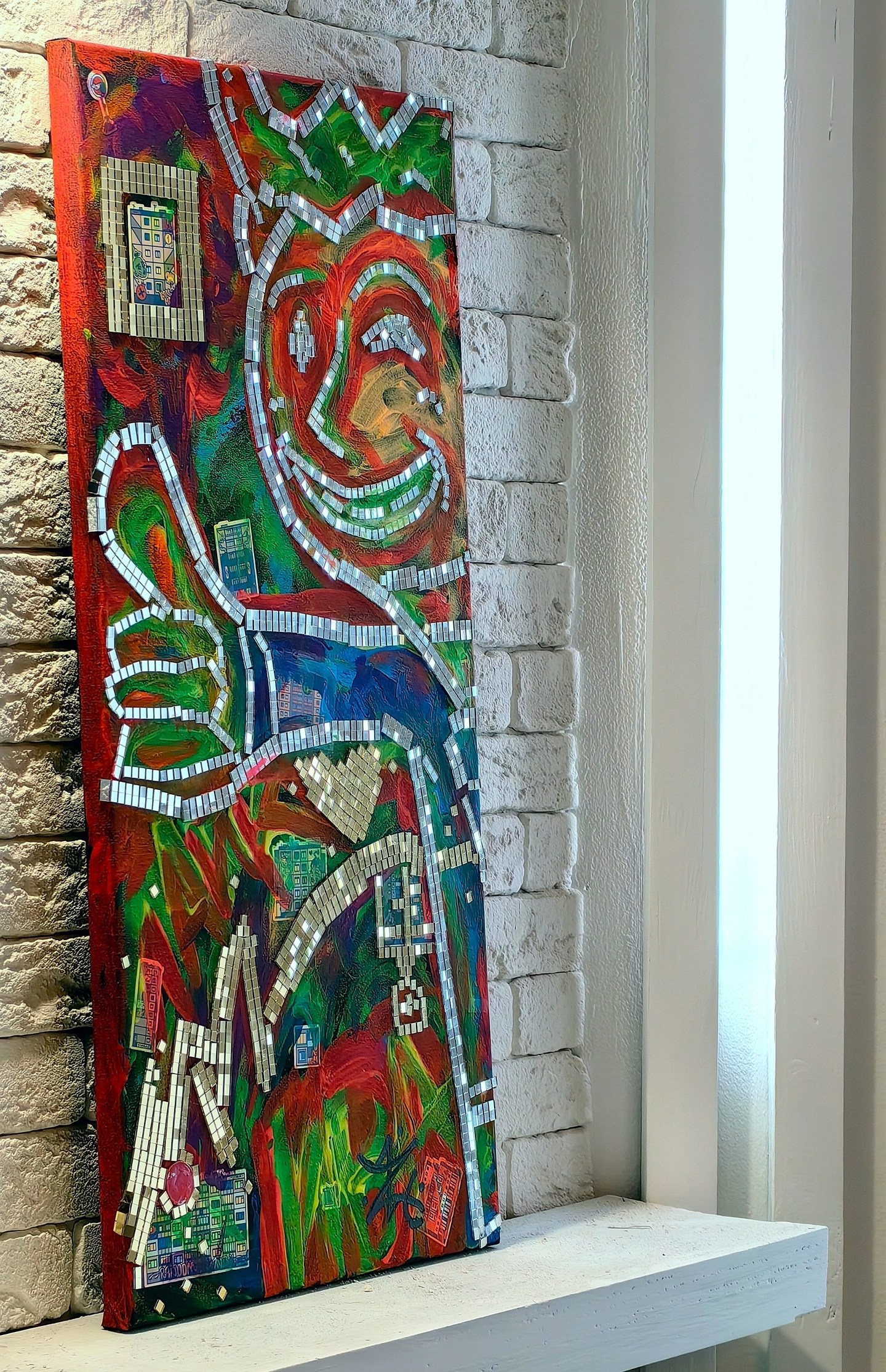 Северное солнце триптих, холст, акрил, подсветка. Картина рельефная состоит из трех самобытных частей: центр «Танцы» D40 см, круглый холст со светодиодной подсветкой по торцу, освещает боковые части слева - квадрат «Озеро» 50х50 см , справа - «Закат» 50х50 с