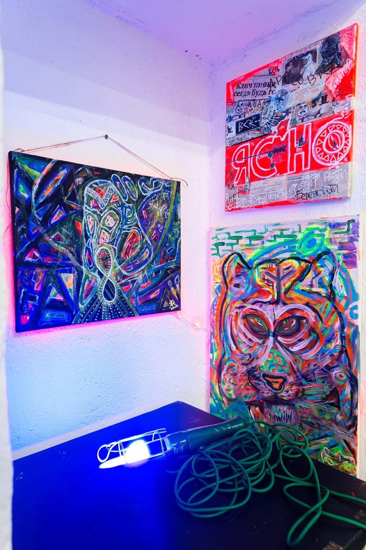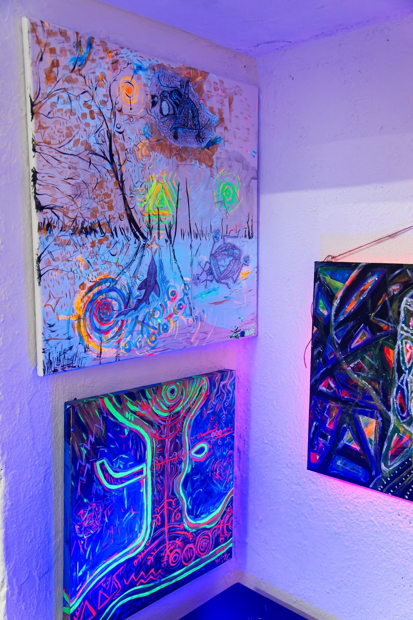 Картина слева "Феникс" холст 40х50 см, акрил флуоресцентный. Картина справа "Way" холст 40х50 см, акрил флуоресцентный.